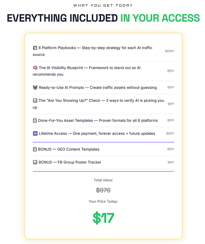 Compared to ads or hiring someone to optimize your content $17 is low. Its meant to be easy for anyone to use AI traffic without spending a lot.
